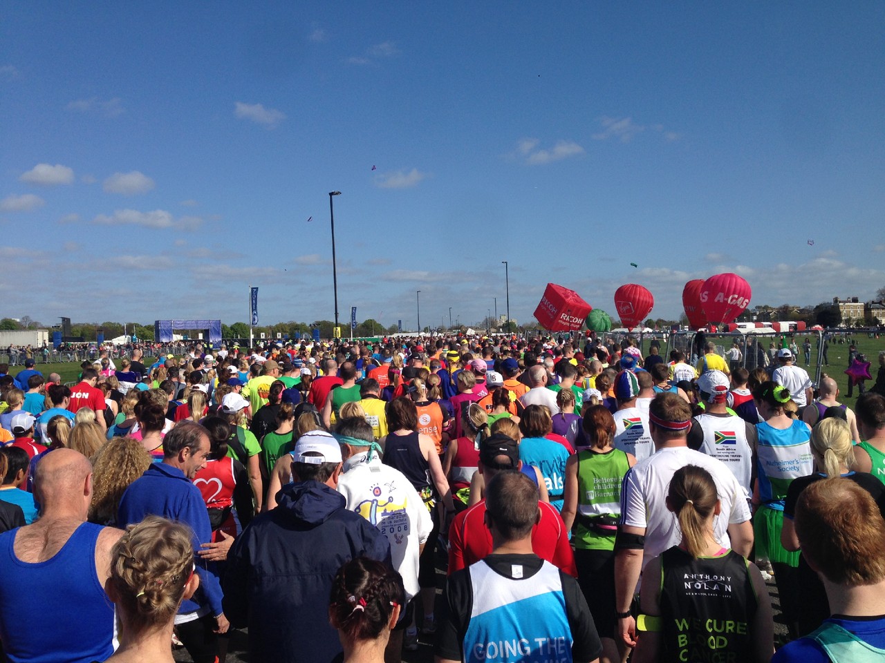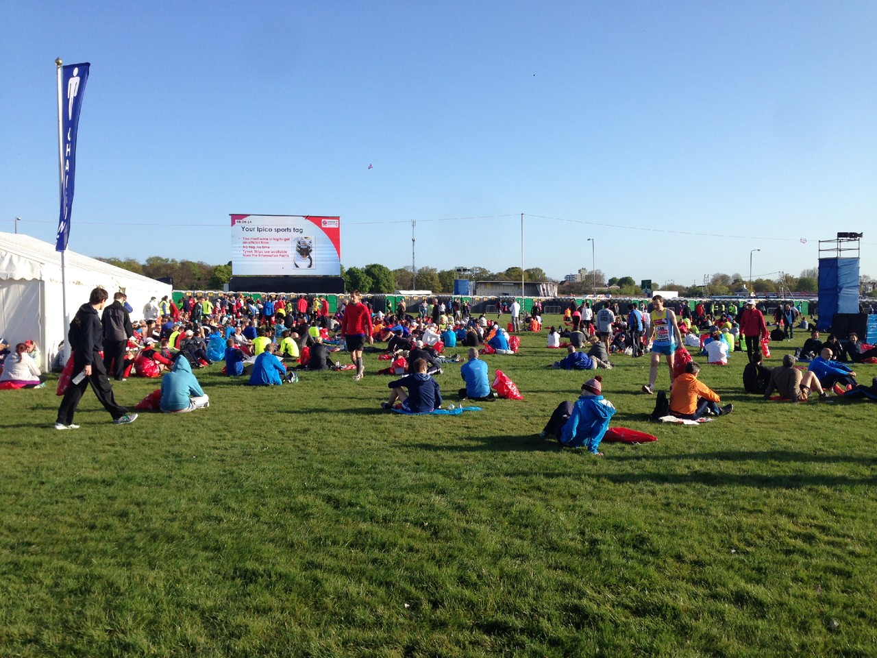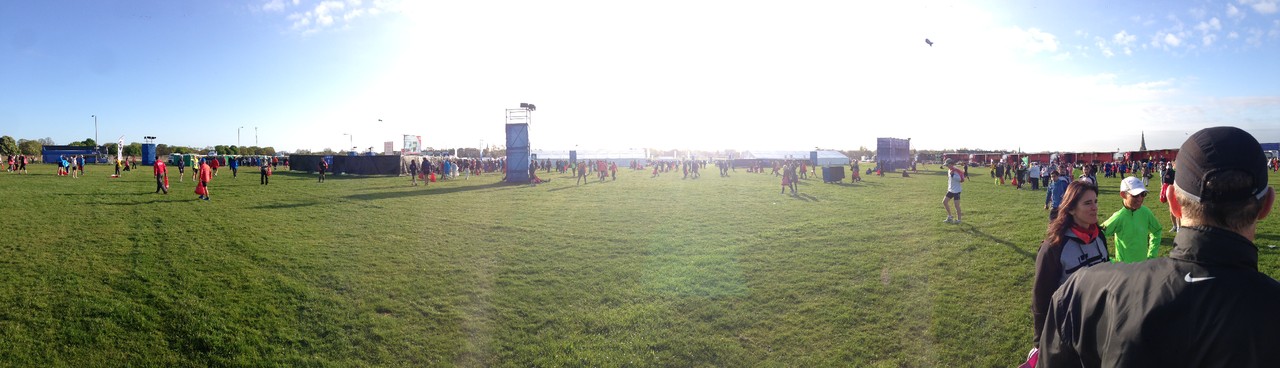 Tendo sido colocado na Blue Start, fomos levados para um enorme relvado, vedado, onde tínhamos à nossa espera café, chá, leite, água e isótonico, isto para não falar nas centenas de WC alinhados no recinto e devidamente coordenados por elementos da organização. O tempo até à partida foi passado em amena conversa, apanhando um fantástico banho de sol e a hidratar para a prova.