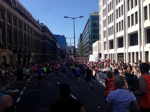 Passada à ponte pude ver a Tower of London, onde estarão depositadas as jóias da coroa. A partir daqui o percurso abre para ruas mais largas e entra-se numa zona em que é possível ver passar os atletas que já estão a passar o pórtico dos 35km.