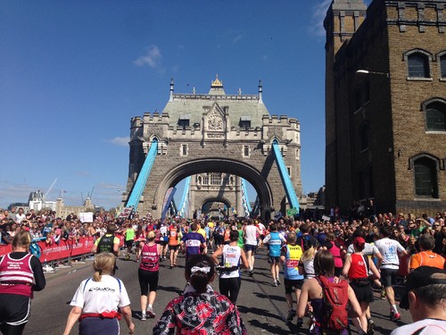 Mais à frente, por volta do km 20, no dobrar de uma esquina surge de surpresa a Tower Bridge. Aqui, fosse pela energia do público, fosse pela paisagem, senti aquele arrepio no estômago e uma emoção quase transcendental.