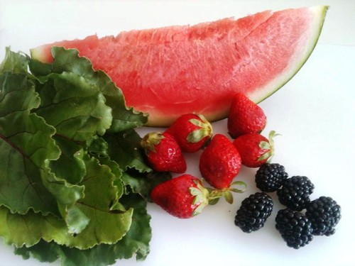 A melancia é ótima porque tem muitas vitaminas e poucas calorias, os morangos, amoras (ou mirtilos) também e ainda têm efeitos antioxidantes, além de serem deliciosos! No caso da melancia pode-se ou não tirar as sementes. Eu optei por não fazê-lo porque as sementes não fazem mal nenhum e acabam por ser trituradas e ficam depositadas no sumo, tipo borras.