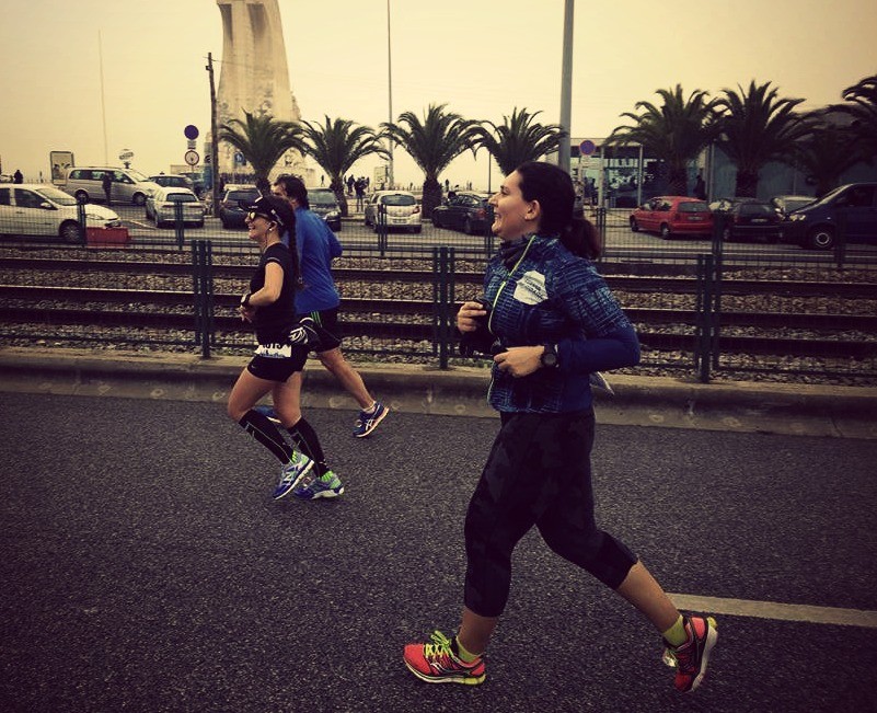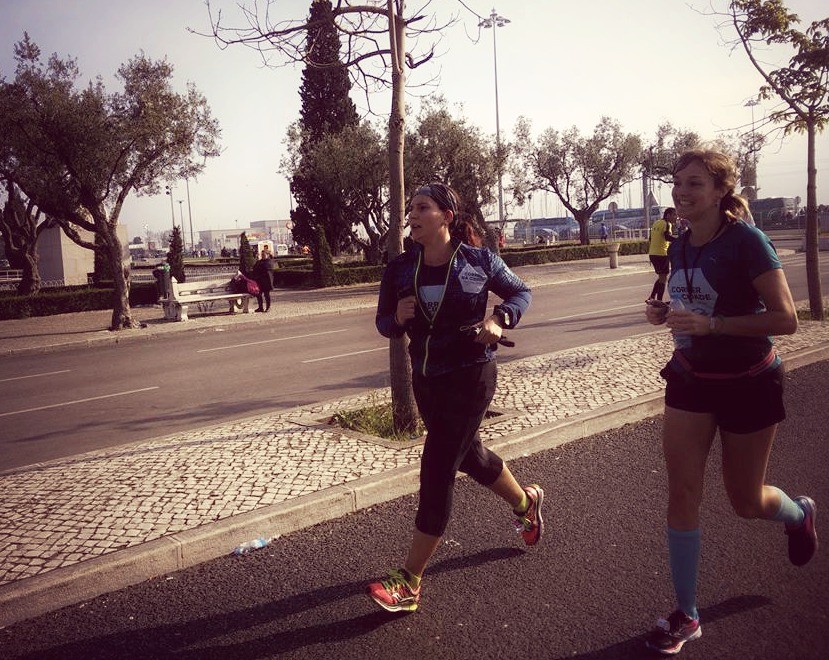 Estava eu a caminhar pela primeira vez enquanto comia uma marmelada quando junto à placa dos 15km vislumbro a Bo. “Mas que raio faz ela aqui?!” Pois bem, vinha cumprir o que tínhamos combinado previamente… depois de puxar pela Ana o que a levou a bater um PBT pessoal aos 10k, voltou para trás para me apanhar. Não há dúvida que esta miúda é uma força da natureza!!! Por esta altura já tinha as pernas a “berrar” comigo... a verdade é que treinos acima dos 10k têm sido escassos, pois tenho estado focada em criar ritmo, e apenas por desencargo de consciência, tinha feito um treino de 16km do Parque das Nações até Belém 15 dias antes, num ritmo muito mais baixo do que o que estava a imprimir na prova. Portanto entre o cubo da marmelada e a alegria da Bo lá consegui arranjar energia para me manter numa postura digna mas forçada até ao final da prova. Deixei de repetir o mantra dos “2:15” e passei para “2:20” “2:20” “2:20”